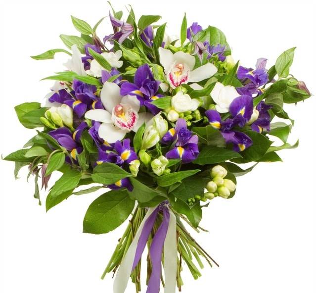 Букет «Чародейка» невероятно яркий и энергичный. В нем гармонично сочетаются белые изящные орхидеи, яркие насыщенные фиолетовые ирисы и нежные утонченные альстромерии. Особую пикантность композиции придает декор из красочной ленты без использования каких-либо оберток. С помощью такого букета вы сможете поднять настроение, подарить заряд бодрости и энергии на весь день, а также получить прощение дорогого человека, ведь смотря на такую яркую и выразительную цветочную композицию невозможно испытывать негативные эмоции.