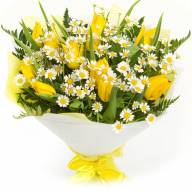 Букет «Солнечный подарок» невероятно яркий и красочный. Он состоит из ярко-желтых тюльпанов, которые дарят своему получателю яркие солнечный эмоции, счастье и истинное наслаждение. Нежную нотку букету придает наличие в нем милых маленьких ромашек, они олицетворяют доброту, скромность и невинность. Эта очаровательная композиция поможет вам завоевать искреннее чувство симпатии или же загладить вину перед любимым человеком. Такой подарок не забудется никогда.